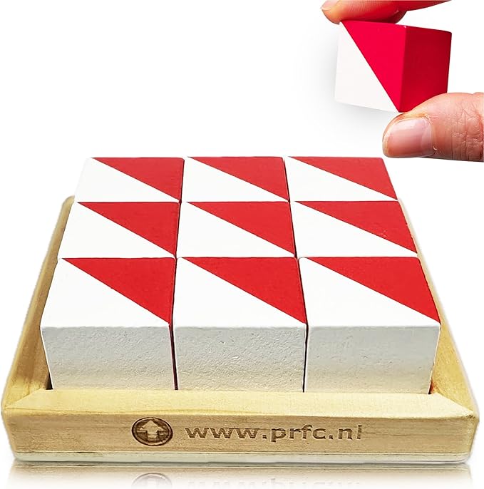 The set includes 9 red and white cubes (2.5 cm each side). The cubes are made from high quality wood and later, manually painted.